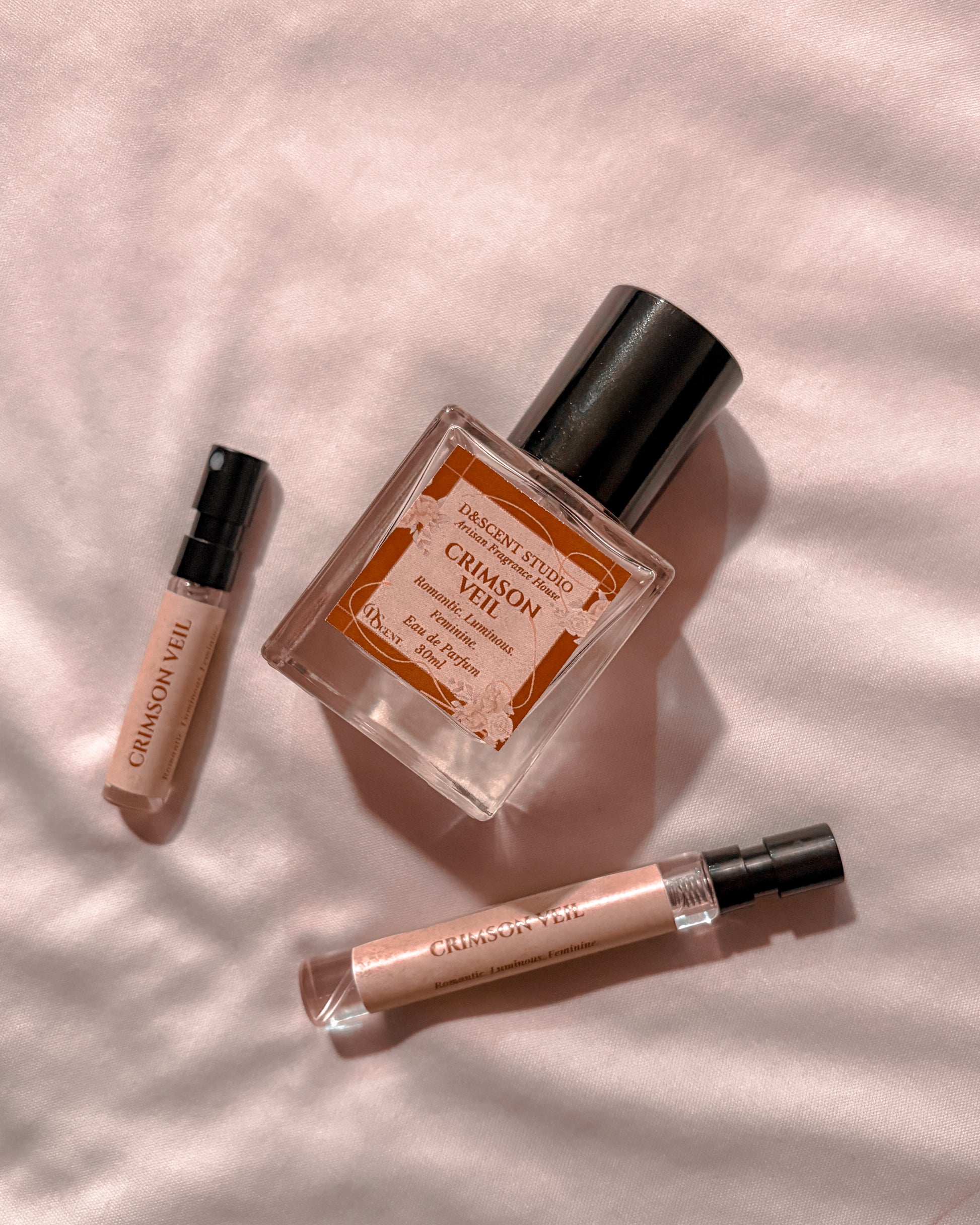 Crimson Veil feels like golden hour in a bottle. Soft, warm, and a little mysterious. It opens with a gentle sweetness and a floral glow, then melts into smooth woods and a cozy amber finish. It’s the kind of scent that feels comforting but still turns heads, like a warm hug with a little spark behind it. Easy to wear, inviting, and quietly unforgettable.